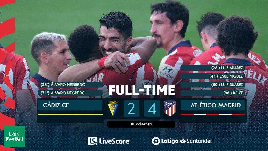 به گزارش دیلی فوتبال؛ تیم های کادیز و اتلتیکو مادرید در چارچوب بازی های هفته بیست و یکم مسابقات لالیگا به مصاف یکدیگر رفتند که این بازی با نتیجه 4 بر 2 به سود اتلتیکومادرید به پایان رسید.