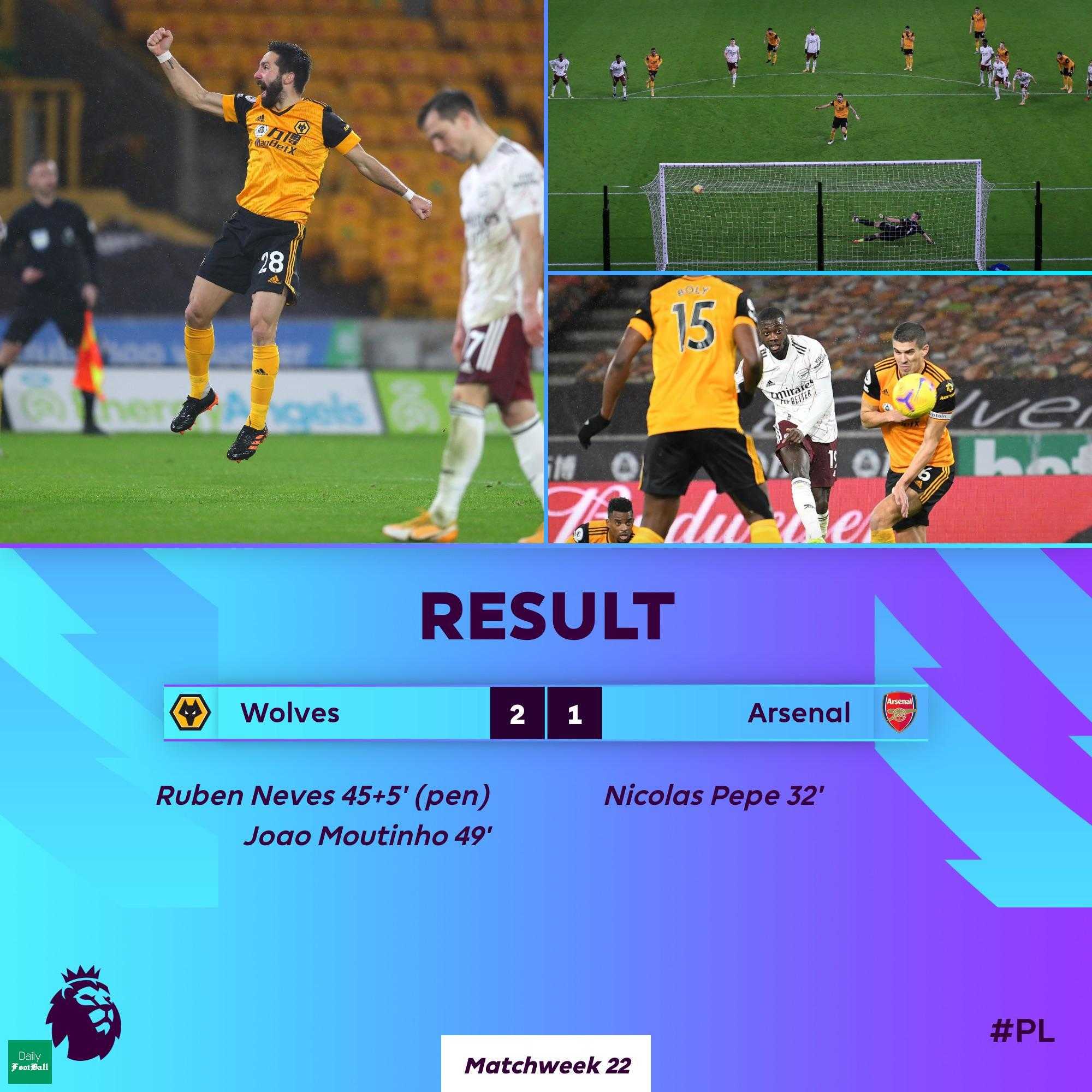 گل های این بازی را نیکلاس پپه در دقیقه 32 برای آرسنال و روبن نوس در دقیقه 5+45 از روی نقطه پنالتی و ژوائو موتینیو در دقیقه 49 برای ولورهمپتون به ثمر رساندند.