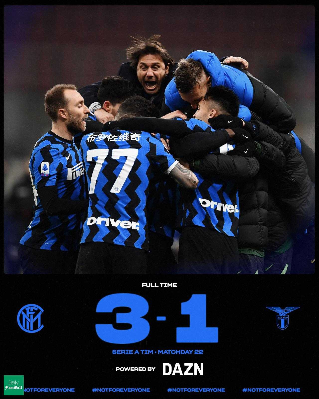 به گزارش دیلی فوتبال؛ تیم های اینتر و لاتزیو در چارچوب بازی های هفته بیست و دوم مسابقات سری آ به مصاف یکدیگر رفتند که این بازی با نتیجه 3 بر یک به سود اینترمیلان به پایان رسید.