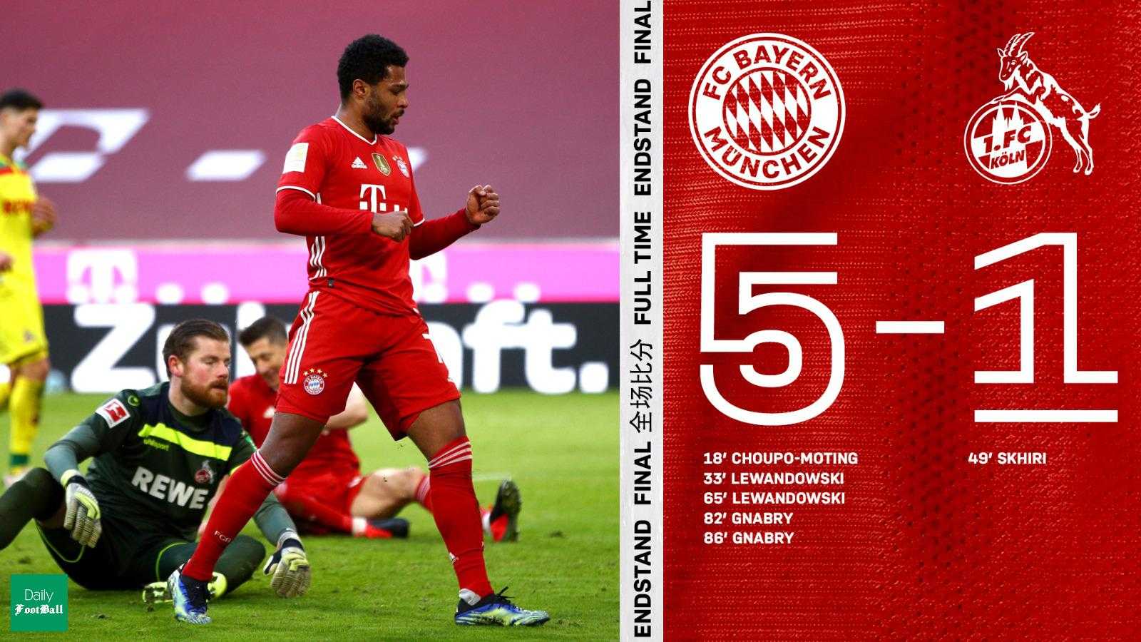 به گزارش دیلی فوتبال؛ تیم های بایرن مونیخ و کلن در چارچوب بازی های هفته بیست و سوم مسابقات بوندس لیگا به مصاف یکدیگر رفتند که این بازی با نتیجه 5 بر یک به سود باواریایی ها به پایان رسید.