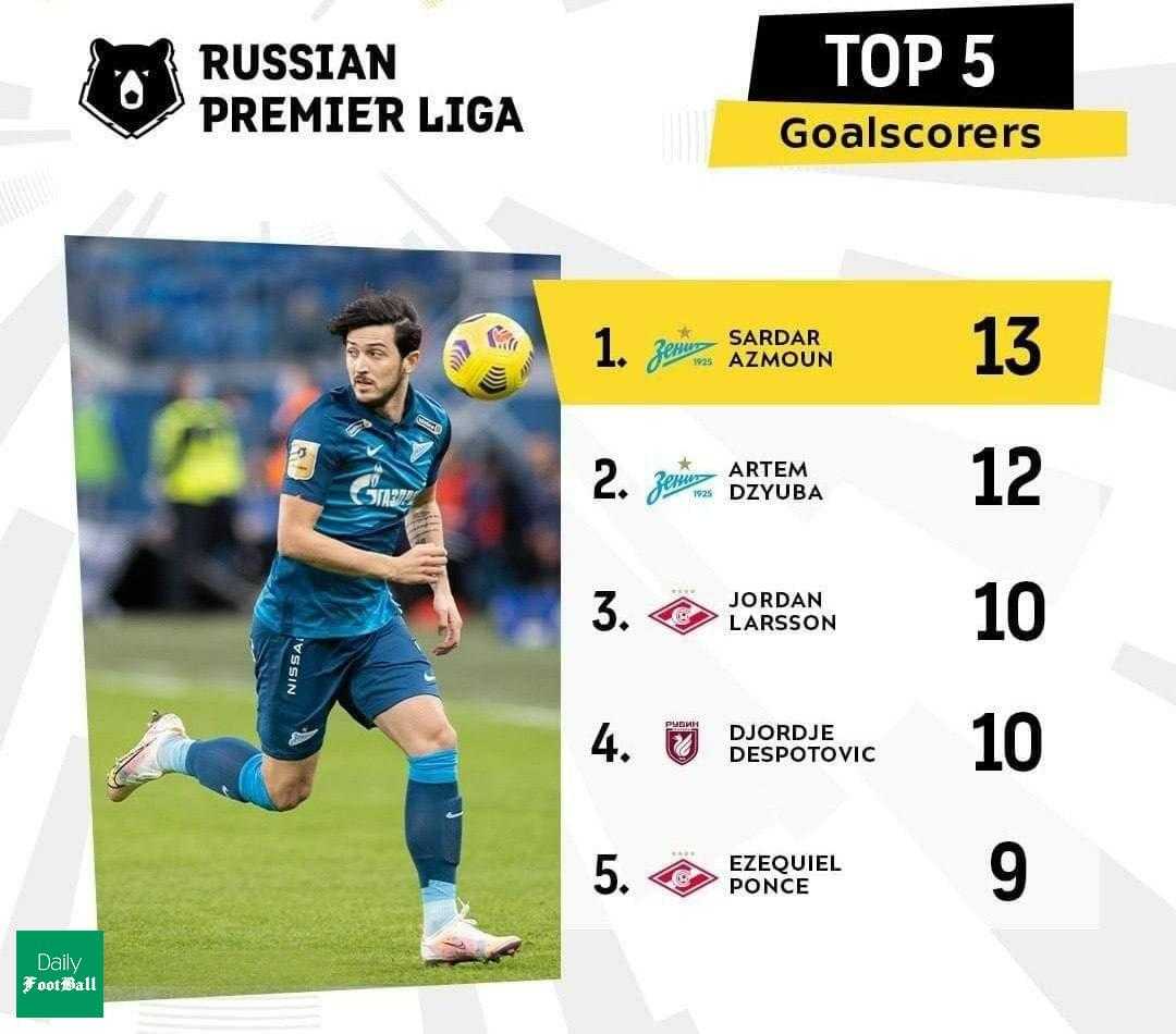 به گزارش دیلی فوتبال؛ تا پایان هفته بیست و دوم مسابقات لیگ روسیه، سردار آزمون مهاجم ایرانی زنیت موفق شده 13 بار دروازه حریفان را باز کند و از این حیث در صدر گلزنان این لیگ قرار دارد.