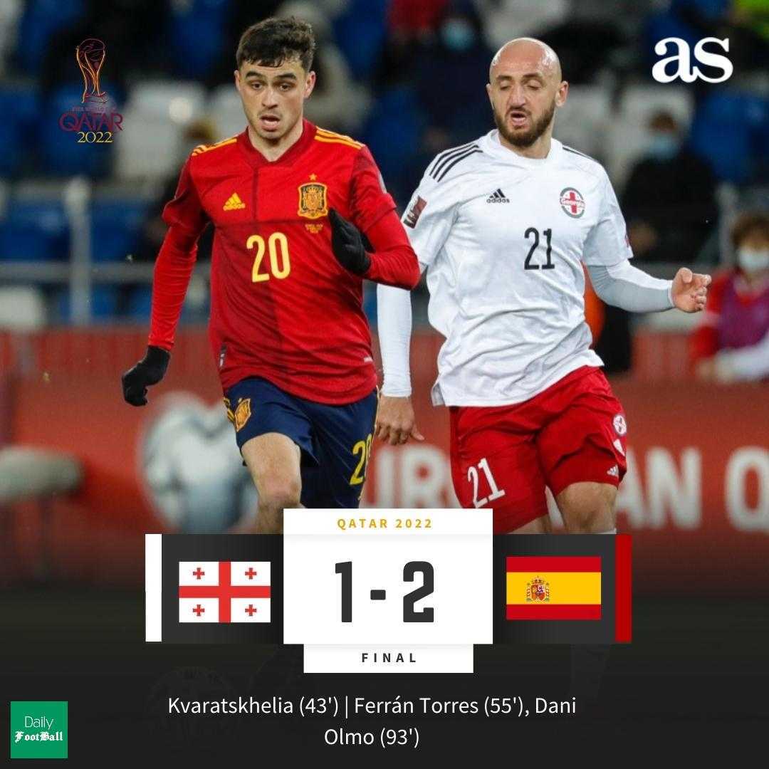 به گزارش دیلی فوتبال؛ تیم های ملی گرجستان و اسپانیا در چارچوب بازی های مرحله گروهی مسابقات انتخابی جام جهانی 2022 به مصاف یکدیگر رفتند که این بازی با نتیجه 2 بر یک به سود ماتادورها به پایان رسید.