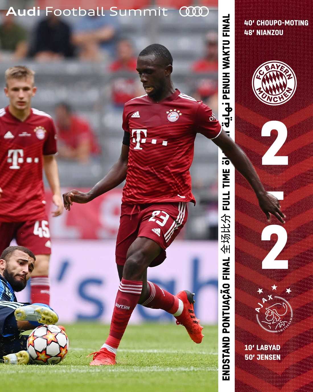 گل های این بازی را زکریا لبیض در دقیقه 10 و ویکتور ینسن در دقیقه 50 برای آژاکس و اریک ماکسیم چوپوموتینگ در دقیقه 40 و نیانزو تانگی در دقیقه 48 برای بایرن به ثمر رساندند.